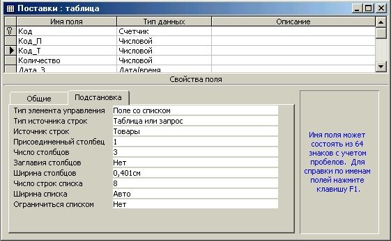 Список для поля Код_Т формируется на основе данных связанной таблицы «Товары». Для создания списка нужно войти в режим конструктора таблицы «Поставки», перейти в строку описания поля Код_Т и выбрать вкладку Подстановки. Для описания способа формирования списка на этой вкладке необходимо установить следующие параметры (рис. 11.7):