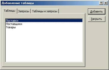 Окно Добавление таблицы состоит из трех вкладок, содержащих перечни объектов, предлагаемых программой для проектирования запроса: Таблицы, Запросы и Таблицы и запросы. При выборе вкладки Таблицы следует выделить нужную нам таблицу из предложенного списка и с помощью кнопки Добавить можно добавить несколько таблиц. При выборе таблиц их символическое изображение появляется в верхней части окна конструктора запроса. Например, на рис. 11.10 для построения запроса выбрано три таблицы: Поставщики, Товары и Поставки.