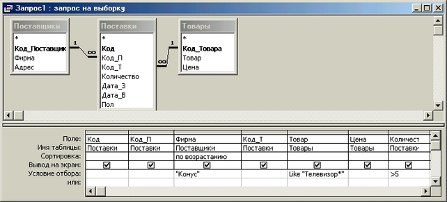 Например, на рис. 11.10, построен запрос, по которому из данных о заказах будут выбраны те, которые выполняет фирма «Конус», наименование товара начинается на символы «Телевизор» и количество более 5.