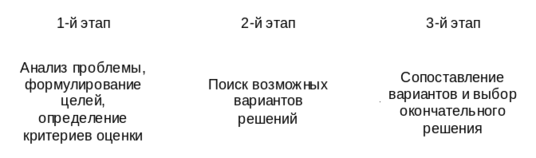 Практика принятия решений многообразна. Однако они реализуются, как правило, по определенной схеме. Для принятия эффективного решения необходимо выполнить ряд работ, складывающихся из отдельных этапов, процедур и операций. Среди многочисленных подходов к решению задачи принятия решения выделим трехэтапную модель Г. Саймона. Модель приведена на рис. 2.5.