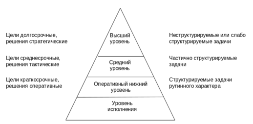 Рассмотрим типы управленческих решений, которые имеют различные характеристики и требуют различных источников данных. На рис. 2.4 показана взаимосвязь типов решений и целей, преследуемых руководством различных уровней.