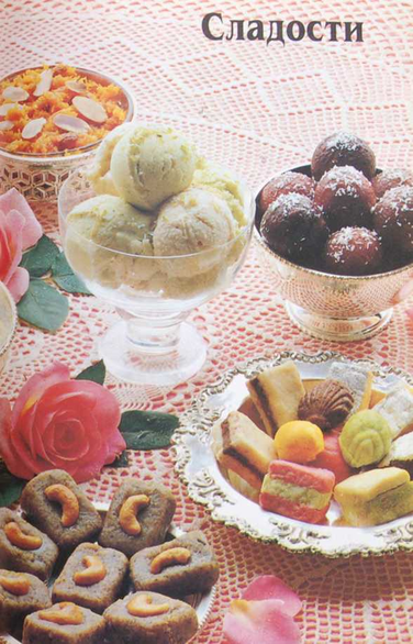 Индийские сладости делают из молочных продуктов, свежих фруктов, злаков, нутовой муки и орехов. Вместо сахарного песка лучше употреблять нерафинированный сахар или мед. Интересно, что очищенный сахар появился в Индии только в период правления Великих Моголов, до этого он не применялся в ведической кухне. Вместо него использовали гур (неочищенный тростниковый сахар) и джаггери (пальмовый сахар). И тот и другой являются замечательными заменителями рафинированного сахара, и мы советуем вам при возможности купить их. чтобы иметь представление об их вкусе. Согласно «Аюр-веде». одной из лучших естественных сладостей является мед, но в ней говорится, что при нагревании он становится ядовитым. Поэтому никогда не применяйте мед при выпечке кондитерских изделий и не доводите до кипения жидкости, в которые вы добавили мед (мед можно добавить в горячую воду или напиток уже после того, как вы сняли их с огня). Для изготовления сладостей можно также использовать и рисовый сахар, ячменный солод и кленовый сироп. Но прежде чем использовать эти заменители, необходимо определить, в каком количестве их класть, так как разные сорта имеют разную сладость. Как правило, одна часть сахарного песка равна одной части прессованного нерафинированного (коричневого) сахара или '/г-Уі части меда.