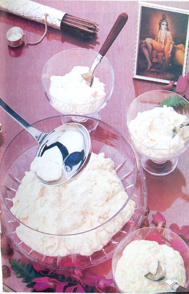 Ранним утром во всех храмах Кришны Ему предлагают молочные сладости, и среди них всегда есть сандеш. Сандеш, приготовленный по этому рецепту, очень вкусен сам по себе, но, если вы хотите ароматизировать или украсить его, добавьте пищевые кра- сители или ароматические вещества или выложите его в различные формочки для кондитерских изделий.
