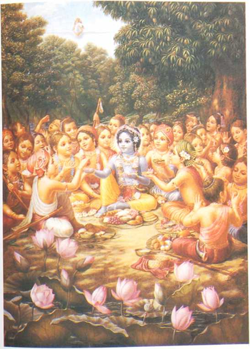 Даже Сам Господь Кришна, приходивший на землю 500 лет назад в облике Шри Чайтаньи Махапрабху. с огромным удовольствием раздавал прасад Своим преданным. В «Шри Чайтанья-чаритамрите», поэме на бенгали, в которой описана жизнь и учение ІІІри Чайтаньи, самого милостивого воплощения Господа, говорится: «Принимать прасад маленькими порциями было не в обычае Шри Чайтаньи Махапрабху. поэтому, раздавая прасад. Он клал на каждую тарелку столько, сколько могли съесть по меньшей мере пять человек. Каждый наедался так. что не мог уже проглотить ни ложки, потому что Шри Чайтанья Махапрабху непрестанно повторял, обращаясь к разносчикам: „Кладите больше! Кладите больше!"» А поскольку Господь Чайтанья — Сам всеведущий Господь, Он точно знал, какого блюда хочет каждый, приводя всех в крайнее изумление. Так Он кормил преданных, пока они не наедались до полного удовлетворения.