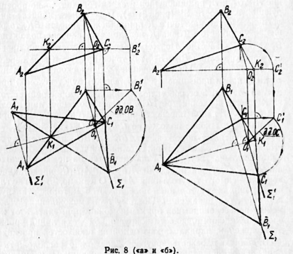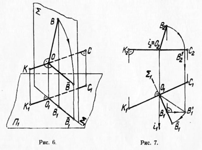 В связи с этим на комплексном чертеже (рис. 7) новое (искомое) положение В1 точки В может быть найдено, если на горизонтальной проекции Σ1 плоскости Σ отложить от центра вращения О действительную величину радиуса вращения ОВ.