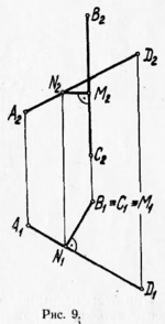 Для решения этой задачи с помощью комплексного чертежа целесообразно одну из скрещивающихся прямых привести в проецирующее положение (не нарушая взаимного расположения этих прямых). Тогда искомый отрезок перпендикуляра между двумя скрещивающимися прямыми изобразится без искажения на соответствующую плоскость проекций (рис. 9): в данном примере отрезок MN, будучи перпендикуляром к ВС, является параллельным плоскости П1 а, следовательно, изобразится на П1 в истинную величину.