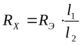 Изменяя сопротивление (Rэ ) и передвигая контакт (С), находят для него такое положение, при котором нулевой инструмент покажет отсутствие тока. Этому положению контакта соответствует равенство отношений Rх /Rэ и l1 /l2 , т. е. В ветви (ДС) не будет проходить ток, если выполняется равенство:
