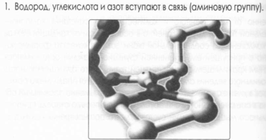 Водород, углекислота и азот вступают в связь (аминовую группу)