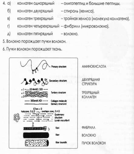Случается так, что разные типы коллагена, обозначенные здесь римскими цифрами, до определенной фазы развития ничем не отличаются друг от друга, кроме того, что присутствуют в разных тканях организма. Однако им присваивают отдельные цифры, поскольку некоторые из них останавливаются на определенном уровне (ряду) развития, например, на этапе тройной хелисы (трехрядный вид), или на фибрильном этапе (четырехрядная конструкция). «Не желающим» создавать волокна (пятирядным) присваиваются следующие цифры.