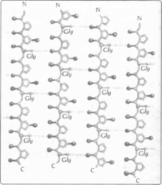 Особенной отличительной чертой коллагена является также нигде в природе не встречающаяся совершенно необычная последовательность размещения аминокислот в пептидных цепочках. Они всегда создают «тройки», словно бусы сознательно и умышленно нанизанные в таком порядке на нить ожерелья. И всегда первой в последовательности такой тройки стоит глицин, а за ним другие аминокислоты. Наиболее распространенный состав такой «тройки» это комбинация: