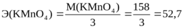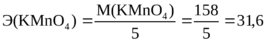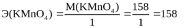 Эквивалентная масса (Э) - масса одного моль-эквивалента - окислителя или восстановителя определяется делением молярной массы окислителя или восстановителя на число принятых или отданных электронов соответственно. Эквивалентная масса перманганата калия будет различной в зависимости от реакции среды: M(KMnO4) = 158 г/моль,