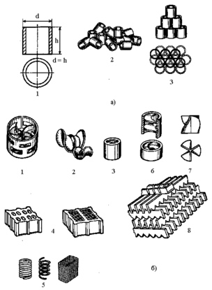 а) кольца Рашига, беспорядочно уложенные (навалом); б) кольца с перегородками, правильно уложенные; в) насадка Гудлое; г) кольца Палля; д) насадка “Спрейпак”; е) седла Берля; ж) хордовая насадка; з) седла “Инталлокс”.