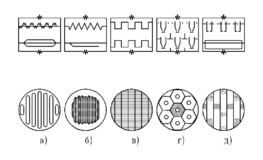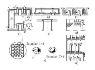 а) с отогнутыми кромками щелей; б) с гофрированной поверхностью; в) со ступенчатым расположением листов; г) с двумя зонами контакта; д) с большим количеством переливов.