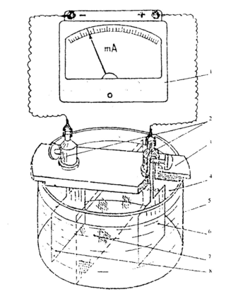 1-миллиамперметр; 2-клемы; 3-пластина; 4-расвор NaCl; 5- ванна стеклянная; 6- медный электрод; 7- пористая перегородка; 8- цинковый электрод.