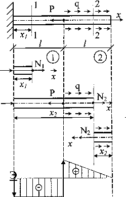 В пределах первого участка мысленно рассечем брус на 2 части нормальным сечением и рассмотрим равновесие, допустим левой части, введя следующую координату х1, рис.1 б: