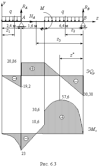 2. Построим эпюры внутренних силовых факторов, откладывая вычисленные значения на графике (рис.6.2). Соединим полученные точки прямыми линиями на участках, где аргумент z входит в первой степени и параболами, где z входит во второй степени. Таким образом, эпюра изгибающего момента на первом участке будет криволинейной, остальные участки эпюр будут прямолинейными. Определим опасное сечение балки, т.е. сечение, в котором изгибающий момент достигает наибольшего по модулю значения. Опасным сечением будет сечение на опоре, где