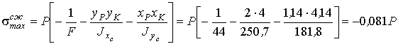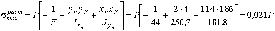 х Р , у Р – координаты точки приложения силы Р (точки А ) относительно центральных осей х Р = -1,14 см, у Р = 2 см.
