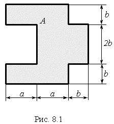Короткий чугунный стержень, поперечное сечение которого изображено на рис.8.1, а = 3 c м, b = 2 см, сжимается продольной силой Р , приложенной в точке А . Допускаемые нормальные напряжения: на сжатие
