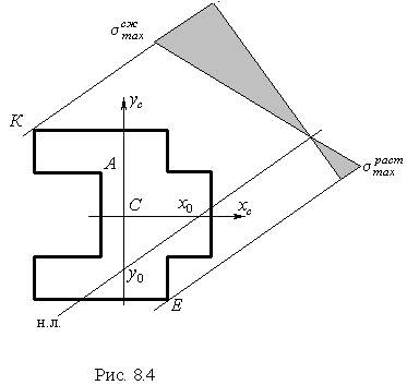 | Отложим отрезки х 0 и у 0 и проведем через них нейтральную линию (рис.8.4). Нейтральная линия делит сечение на две части, в одной возникают напряжения сжатия, в другой – растяжения. В точке А прикладывается сжимающая сила Р , поэтому часть, включающая т. А – область сжатия, другая часть – область растяжения. Максимальные напряжения возникают в точках сечения наиболее удаленных от нейтральной линии. Для определения этих точек проведем линии параллельные нейтральной, получим в растянутой части точку К (-4,14; 4), в сжатой точку Е (1,86; -4) (рис.8.4). Подставляя в формулу (8.1) вычисленные значения моментов инерции, а также координаты точки приложения нагрузки и точек, где возникают наибольшие сжимающие (т. К ) и растягивающие (т. Е ) напряжения, получим: |