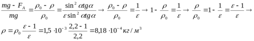 Два одинаково заряженных шарика подвешены на одинаковых непроводящих невесомых нитях в одной точке. Нити разошлись на некоторый угол а. После погружения всей системы в масло угол расхождения нитей не изменился. Какова плотность масла? Относительная диэлектрическая проницаемость масла 2,2. Плотность материала шариков 1,5*103 кг/м3.