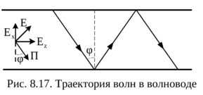ак было показано в разделе 8.2, поперечные волны в принципе не могут распространяться в волноводе. Следствием этого может быть только одно, а именно то, что волны в волноводе могут распространяться только по наклонным к оси волноводам траекториям путем многократного отражения от стенок. Это можно легко подтвердить с помощью рис.8.16. Например, в случае волны типа Е силовые линии электрического поля имеют как поперечную, так и продольную составляющую. Поэтому вектор Е, а, значит, и вектор Пойнтинга, указывающий направление распространения, ориентированы под углом φ к стенкам волновода.