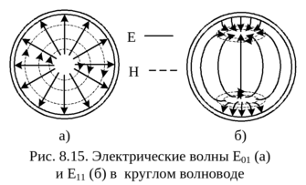Так как составляющая Еφ =0, то в плоскости поперечного сечения волновода имеется чисто радиальное электрическое поле, а из–за того, что Нr=0, магнитные силовые линии в плоскости поперечного сечения волновода образуют семейство концен-трических окружностей с центром на оси волновода. Используя общий принцип, можно построить картины полей волн более сложного вида – Е02, Е11 и т.д. Картина поля волн Е01 и Е11 приведена на рис.8.15.