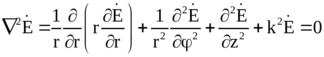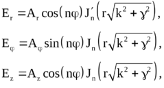 Подобно тому, как это было сделано в случае прямоугольного волновода, решение этого уравнения в общем виде можно записать в виде произведения трех функций, каждая из которых является функцией одного аргумента: