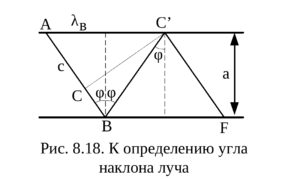 =2а) волна вдоль волновода не распространяется, отражаясь в поперечной плоскости от стенок волновода, образуя стоячую волну. При этом, как было показано с помощью формул (8.13) и (8.14), фазовая скорость и длина волны обращаются в бесконечность. В этом также легко убедиться с помощью рис.8.18. Пусть отрезок АС равен расстоянию, на которое переместился фронт падающей волны со скоростью света за время, равное периоду колебания высокой частоты. Этот путь по определению равен длине волны в пустоте
