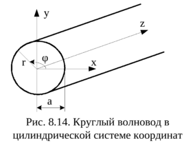 руглый волновод представляет собой полую металлическую трубу круглого сечения. По аналогии с прямоугольным волноводом, в круглом волноводе векторы поля Е и Н определяются в результате решения волновых уравнений (8.1). В системе прямоугольных координат решение волновых уравнений имеет весьма громоздкий вид. Поэтому в случае круглых волноводов логично применить цилиндрические координаты r, φ, z (рис.8.14), при использовании которых граничные условия выглядят весьма просто: