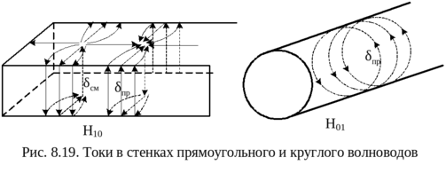 езависимо от применяемых материалов, стенки волновода имеют конечную проводимость. Несмотря на то, что удельная проводимость стенок волновода, выполненного из меди или латуни, весьма высока, при протекании токов проводимости, вызванных действием поля волны, часть ее энергии расходуется на нагрев стенок. Потери в волноводе зависят от структуры поля. Каждой структуре поля соответствует определенная система токов проводимости на его стенках. Токи проводимости на поверхности стенок и токи смещения между стенками образуют замкнутые линии, конфигурация которых определяется типом волны. На рис.8.19 показана картина токов для волны Н10 в прямоугольном волноводе. Здесь же приводится картина поля волны Н01 в круглом волноводе.