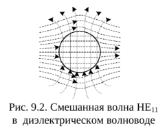В отличие от металлического волновода, в диэлектрическом волноводе могут существовать не только волны типа Е и Н, но и волны смешанного типа НЕ, у которых Нz≠0 и Еz≠0.