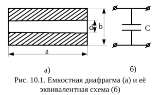 Емкостная диафрагма состоит из тонких металлических перегородок, установленных в поперечном сечении волновода так, что их кромки параллельны широким стенкам (рис. 10.1,а). Уменьшение расстояния между ш