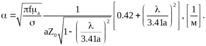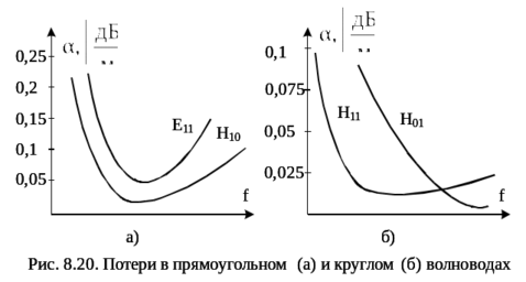На рис. (8.20.а) и (8.20.б) приведены графики зависимости коэффициента затухания в прямоугольном и круглом волноводах.