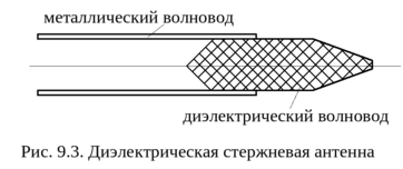 Простейшим типом этой волны является волна НЕ11, картина поля которой представлена на рис.9.2. Особенностью этого типа волны является отсутствие критической частоты. Поэтому волна этого типа возбуждается в волноводе на любых частотах и при любых размерах волновода. На рис.9.3 приведена одна из схем возбуждения диэлектрического волновода путем установки его в металлический волновод. Теория диэлектрического волновода нашла широкое применение при решении различных задач электродинамики, например, при анализе и синтезе диэлектрических стержневых антенн.