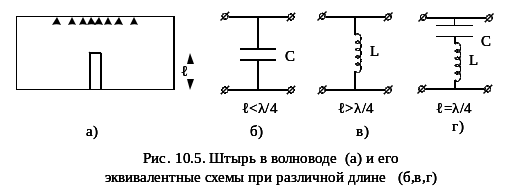 Одиночный металлический штырь, введенный в волновод и соединенный одним концом со стенкой волновода, (рис.10.5а), создает реактивное поле за счет токов проводимости, наведенных в нем бегущей волной. Активной мощности он практически не потребляет.
