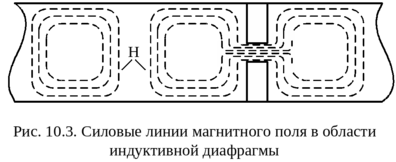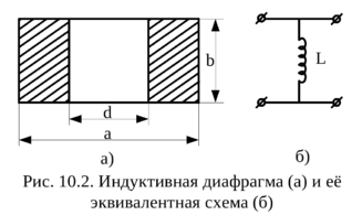 ндуктивная диафрагма состоит из двух тонких металлических перегородок, установленных в поперечном сечении волновода так, что их кромки параллельны вертикальным стенкам волновода (рис.10.2,а). Как показано на рис.10.3, в области диафрагмы возникает сгущение магнитных силовых линий, что соответствует увеличению в этом сечении магнитной индукции. Поэтому такая диафрагма называется индуктивной. В области диафрагмы возрастает магнитная составляющая поля волны, что эквивалентно включению в волновод в сечении диафрагмы шунтирующей индуктивности (рис.10.2.б).
