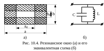а рис.10.4,а представлена диафрагма в виде окна в волноводе. Эта диафрагма образована двумя совмещенными реактивными диафрагмами – емкостной и индуктивной. Такую диафрагму называют резонансной, или резонансным окном. Резонансная диафрагма эквивалентна параллельному колебательному контуру из сосредоточенных элементов (рис.10.4.б) Размеры диафрагмы выбираются исходя из резонансной частоты: