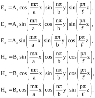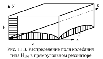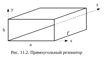 ассмотрим резонатор, выполненный из отрезка прямоугольного волновода (рис.11.2). Картину поля в прямоугольном резонаторе можно составить на основе уже извес-тных нам соотношений для прямоугольного волновода. В отличие от волновода в резо-наторе стоячие волны сущест-вуют по всем трем осям x,y,z. Составляющие поля являются произведениями трех функ-ций, каждая из которых зави-сит от одной координаты и выражает стоячую волну: