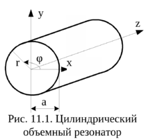 Резонансные системы на СВЧ выполняют на совершенно иных принципах. Как следует из уравнений Максвелла, волновой процесс в любой области пространства сопровождается непрерывным преобразованием электрической энергии в магнитную и магнитной энергии в электрическую, и это по существу есть способ существования электромагнитного поля во времени и пространстве. Поэтому ситуация не изменится, если возбудить электромагнитные колебания в ограниченном пространстве, например, в полом металлическом шаре, цилиндре и т.д. При этом форма подобного «резервуара» принципиального значения не имеет. Подобные устройства называются объемными резонаторами. Аналогию с обычным колебательным контуром легко увидеть на примере цилиндрического резонатора (рис 11.1), в котором боковая поверхность цилиндра служит одним витком колебательного контура, а торцевые поверхности – пластинами конденсатора. Эта аналогия имеет чисто формальный характер, так как в действительности емкости и индуктивности в объемном резонаторе имеют распределенный характер. По этой причине электрическое и магнитное поле не разделены в пространстве, и электромагнитные процессы в объемном резонаторе описываются не уравнениями цепей, а уравнениями Максвелла (волновыми уравнениями).