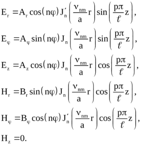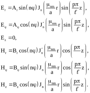 Перейдем к рассмотрению цилиндрического резонатора. Используя формулы для составляющих поля круглого волновода, нетрудно записать выражения для составляющих поля волны Е и Н: