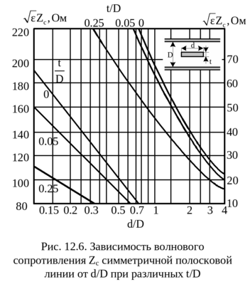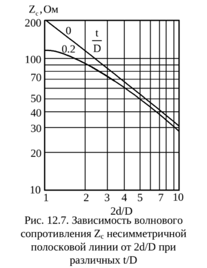 Волновое сопротивление симметричной и несимметричной полосковой линии удобно определить по графикам (рис. 12.6, 12.7).