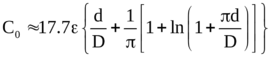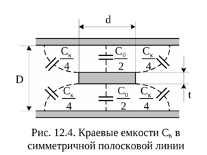 Если величина емкости оказывается меньше 150 пФ/м, то необходимо читывать краевую емкость (рис.12.4), которая определяется по формуле