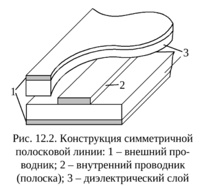 Симметричную полосковую линию можно представить как видоизмененную коаксиальную линию. Последовательность преобразования коаксиальной линии в симметричную полосковую линию показана на рис.12.1,а,б,в. Между двумя проводящими заземленными пластинами 1 заключен ленточный проводник 2, изолированный диэлектриком 3 (рис. 12.2).
