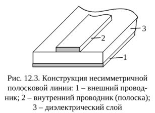 Несимметричная полосковая линия может быть получена путем видоизменения двухпроводной линии (рис.12.1,г,д,е). Согласно граничным условиям на поверхности идеального проводника, двухпроводную линию можно заменить однопроводной линией над идеальной проводящей поверхностью с зеркальным изображением. Таким образом, несимметричная полосковая линия представляет собой ленточную металлическую полоску 1, расположенную на проводящей заземленной пластине 2 и изолированную от нее диэлектрическим слоем 3 (рис.12.3).