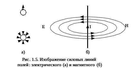 Одним из способов анализа электромагнитных полей является их графическое изображение с помощью так называемых силовых линий. Силовой линией называется линия равного значения напряженности поля, к которой вектор напряженности является касательным в каждой ее точке. В первом случае (рис.1.5,а) силовые линии имеют начало (исток) и конец (сток). Так, силовые линии потенциального электрического поля начинаются и заканчиваются на их источнике (зарядах). В то же время магнитное поле имеет вихревой характер, так как в природе не существует магнитных зарядов, и силовые линии магнитного поля всегда замкнуты на себя, не имея начала и конца (рис.1.5,б).