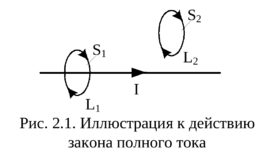 Действие закона можно уяснить на примере проводника, по которому протекает постоянный ток. Как следует из рис. 2.1, интеграл в левой части формулы (2.1) будет не равен нулю только в случае поверхности S1, «натянутой» н