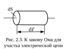Пусть в отрезке проводника весьма малых размеров, цилиндрической формы, длиной dℓ и площадью поперечного сечения dS протекает ток величиной dI. Из-за малости размеров цилиндра будем считать, что плотность тока проводимости в пределах его торцов постоянна, а линии тока параллельны его оси. Согласно закону Ома: