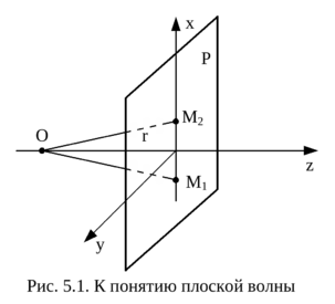 Во многих практических задачах по определению векторов поля без заметных погрешностей можно пренебречь тепловыми потерями, считая среду идеальным диэлектриком. В этом случае волновые уравнения будут иметь простейшее решение. Нетрудно убедиться, что при достаточном удалении от источника излучения волны амплитуда поля не зависит от места расположения рассматриваемой точки на фронте волны. Как следует из рис.5.1, амплитуда поля не изменяется от точки М1 к точке М2, поэтому весь процесс в системе декартовых координат не зависит от x и y, то есть: