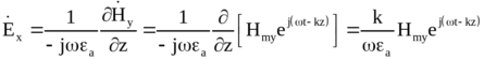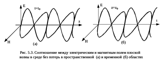 Из (5.24) следует важный вывод о том, что в неограниченных средах без потерь электрическое и магнитное поля совпадают по фазе во времени и пространстве, что иллюстрируется рис.5.3. Используя (5.24), найдем соотношение Е и Н: