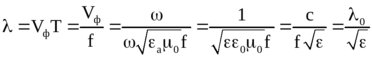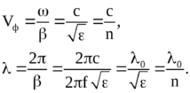 Таким образом, длина волны в диэлектрике меньше длины волны в пустоте при одной и той же частоте. Длина волны, так же, как и фазовая скорость, зависит от диэлектрической проницаемости вещества. Величина